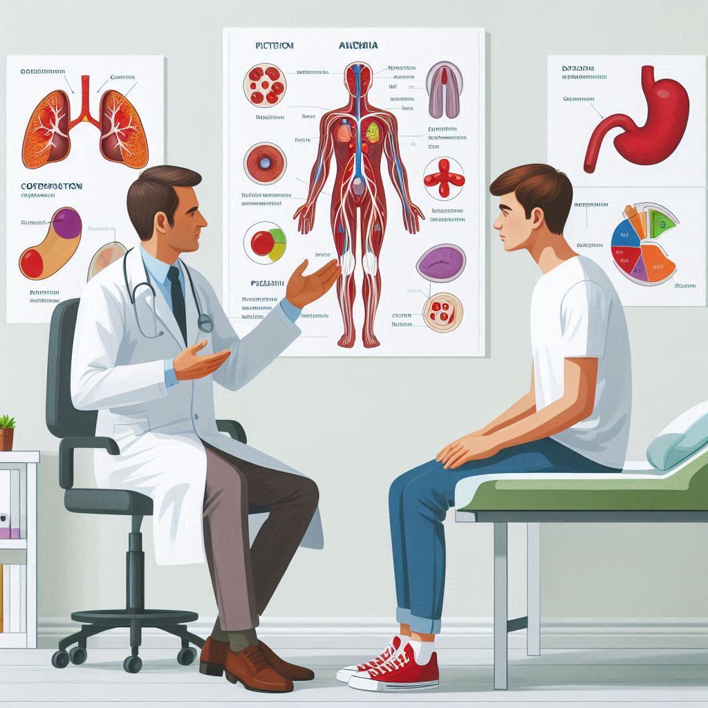 Лечение анемии направлено на устранение причины заболевания и восполнение дефицита необходимых веществ в организме. 1.Коррекция питания: Пациенту рекомендуют продукты, богатые железом (печень, красное мясо, шпинат), а также источники витаминов B12 и фолиевой кислоты (рыба, яйца, молочные продукты).